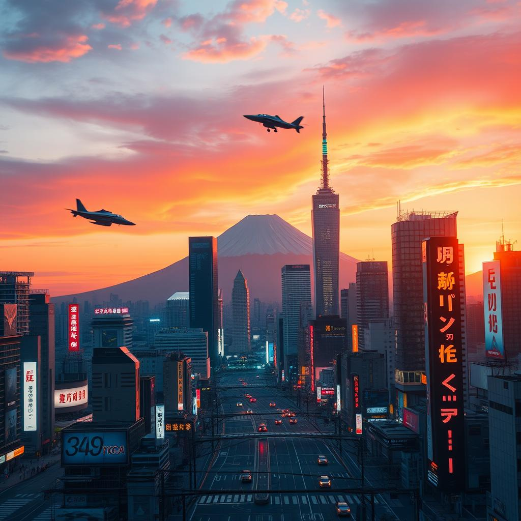 – 未來感東京黃昏天際線,有飛行車、日文霓虹招牌和富士山背景的素描