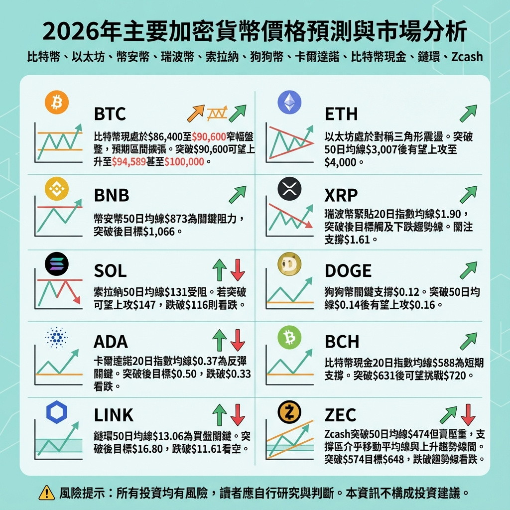 比特幣及主流加密貨幣價格預測:BTC、ETH、BNB、XRP、SOL、DOGE、ADA、BCH、LINK、ZEC