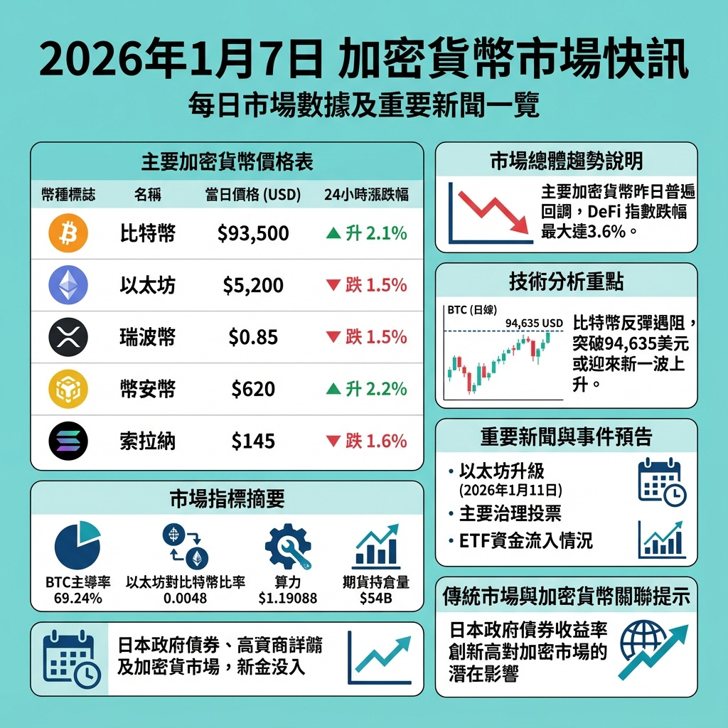 比特幣價格下跌約1.7%,以太坊跌幅超過2%。CoinDesk 20指數下跌近2%。日圓疲軟及日本債市波動成為市場關注焦點。黃金及白銀期貨價格均有小幅下跌。亞洲股市如日經225及恒生指數亦錄得下跌。