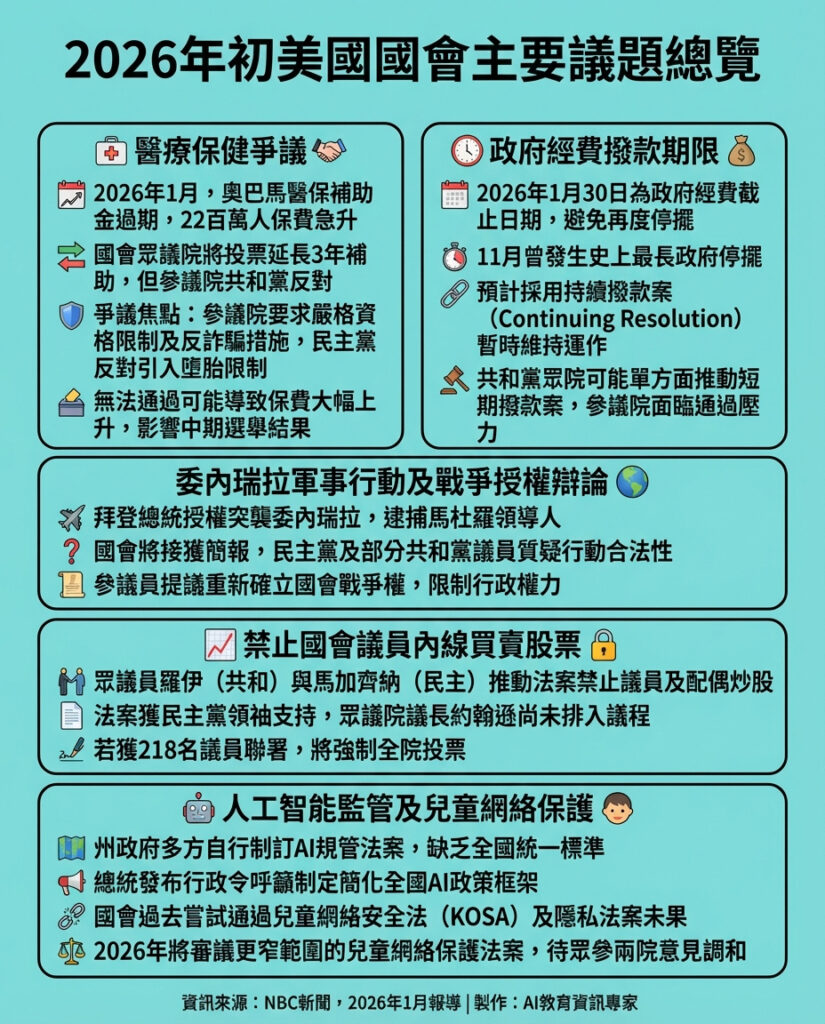 這篇報導清楚梳理了2026年初美國國會面臨的多重挑戰,從國內政策的醫療保健補貼爭議、政府撥款,到外交戰略上的突發軍事行動,乃至社會倫理與科技監管問題,皆一一呈現。這反映出美國政治的複雜性與分歧,也暗示未來幾個月將是政治角力的高峰期。