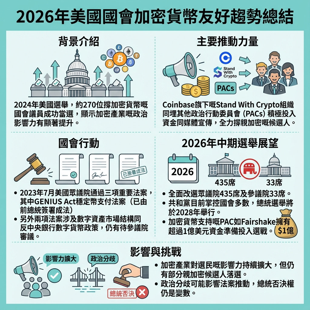 總括來說,2026年的美國中期選舉不僅是政治權力的角逐,更是加密貨幣行業能否持續擴大影響力的關鍵戰場。業界、監管機構及公眾都應保持警覺和理性,確保這場新興科技與傳統政治的碰撞,最終能帶來健康且可持續的發展。