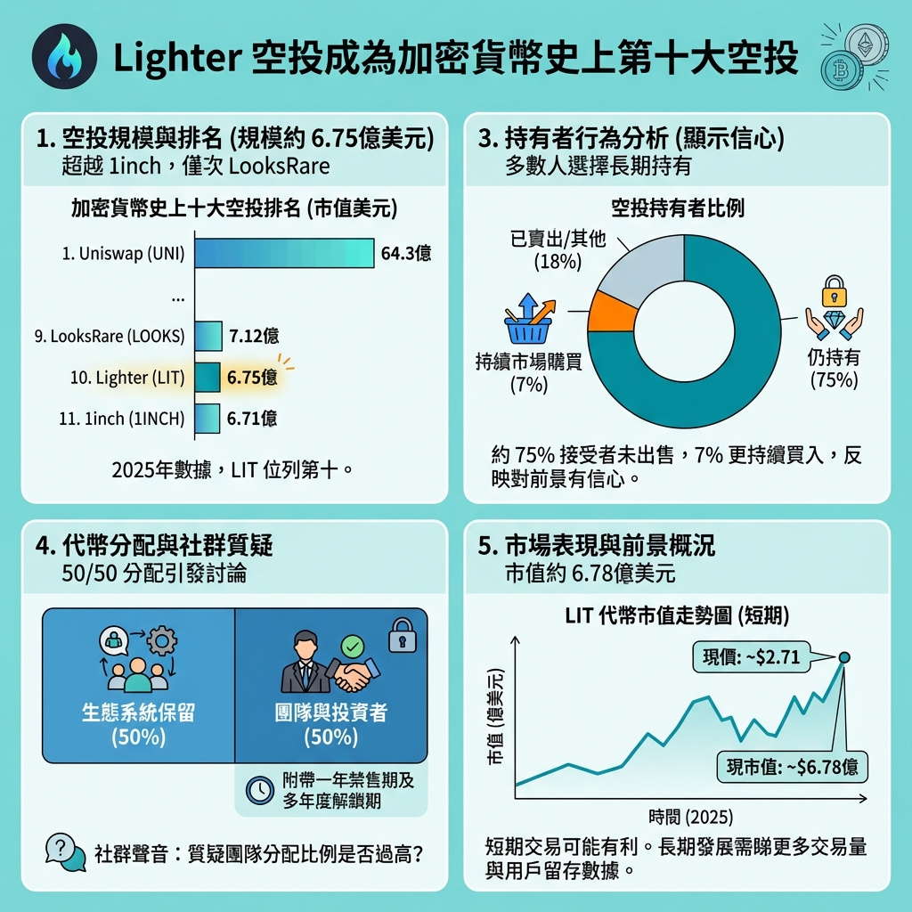 Lighter這次空投的總額6.75億美元,令它成為加密貨幣歷史上第十大最大規模空投,超越了1inch Network於2022年空投的6.71億美元,但仍略低於同年LooksRare的7.12億美元空投。儘管如此,與2020年Uniswap空投的64.3億美元相比,仍有明顯差距,後者至今仍是業界最大規模的空投活動。