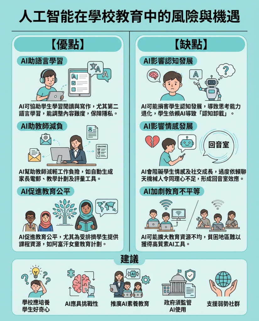 總括來說,AI作為教育工具,絕非萬能解藥,亦非完全的洪水猛獸。關鍵在於如何設計和使用AI,並配合適當的教育策略和監管,才能最大化其益處,減少潛在的傷害。香港教育界可參考報告建議,推動「AI素養」教育,讓學生不單是AI的使用者,更是批判性思考和創造力的主人。這樣,才能迎接AI時代真正的教育革新。