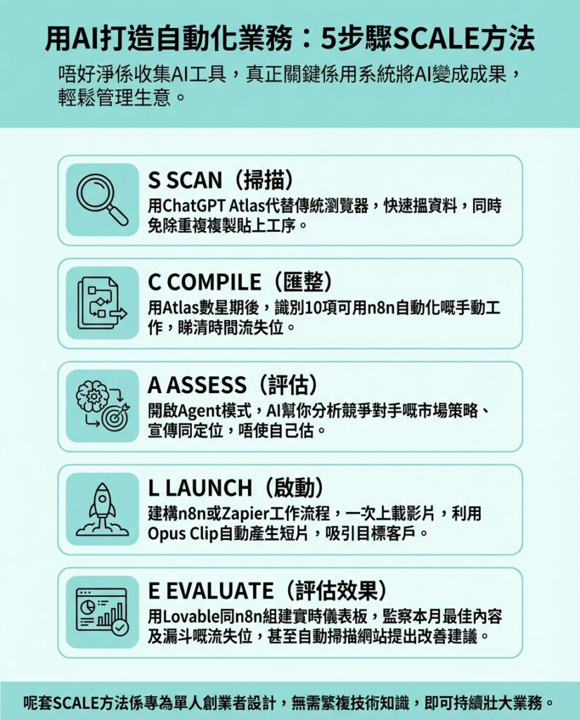 作者提出嘅5步SCALE方法,從資料搜集、任務篩選、競爭分析,到自動化執行及效果監控,全方位覆蓋咗創業者最頭痛嘅環節。特別係利用ChatGPT Atlas同自動化平台n8n、Zapier,令過去繁複嘅工作變得輕鬆又高效,值得本地創業者借鑒。