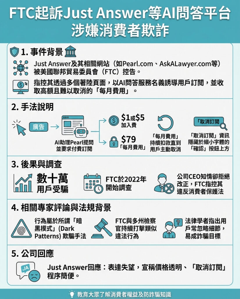 值得注意的是,JustAnswer的CEO知情卻不改變做法,反映企業在利潤驅使下往往忽視用戶體驗和誠信經營。這種情況挑戰了現行監管機制的有效性,也呼籲消費者必須更加警覺,仔細閱讀每一條細則,尤其是那些用細字隱藏重要資訊的情況。