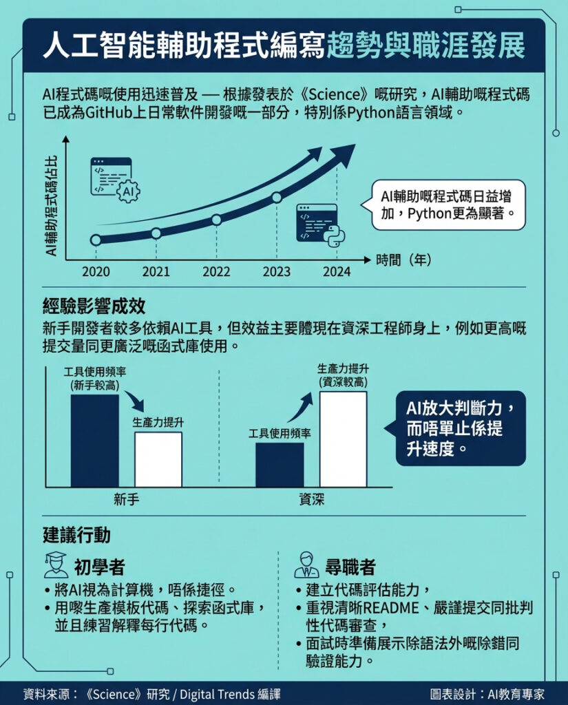 對香港的年輕程式設計師而言,這提醒我們不要盲目依賴 AI,否則可能陷入「表面加速、實質技能停滯」的陷阱。相反,應該積極培養批判思維和問題解決能力,善用 AI 來擴展視野和提升工作質素。企業在招聘時亦應調整評估標準,將重點放在候選人的判斷力與代碼質量,而非單純的產量。