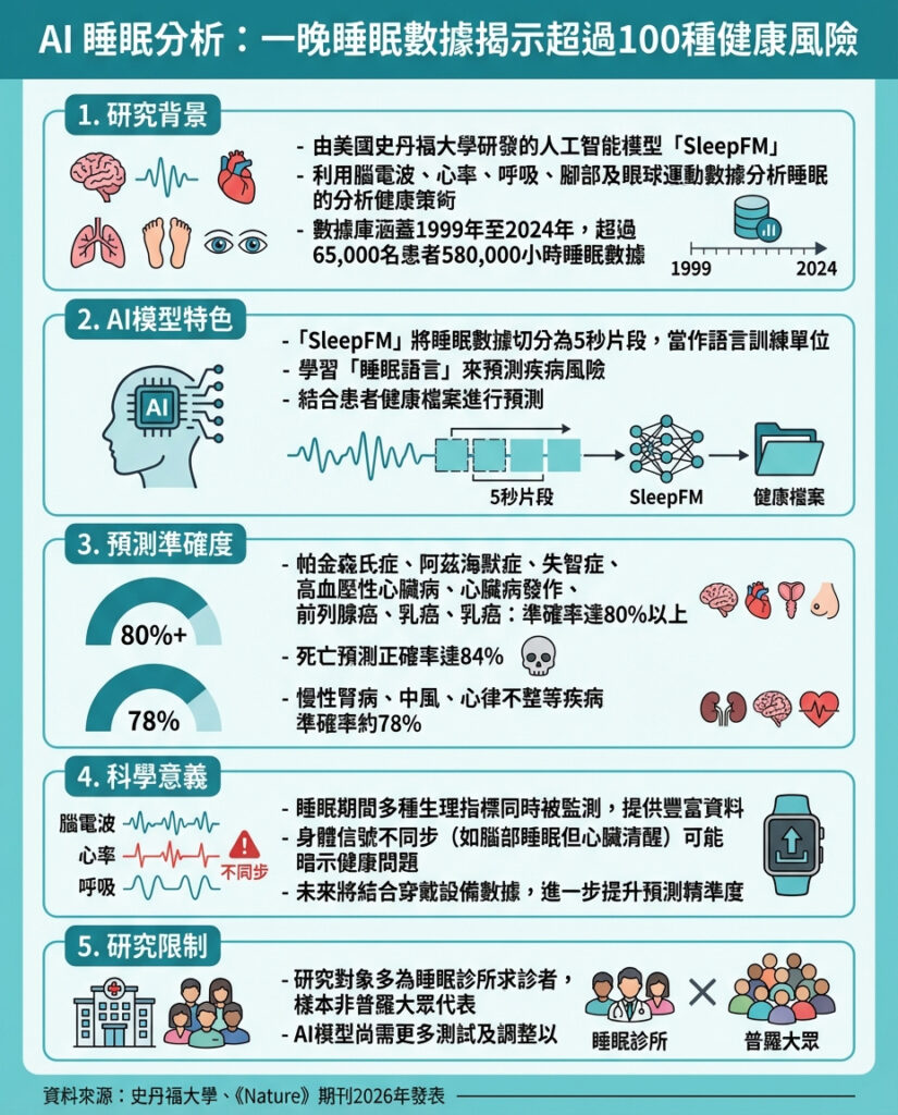 美國斯坦福大學的研究團隊開發出一款名為SleepFM的大型語言模型(LLM),這款人工智能系統能夠透過分析人體在睡眠期間的腦電波、心率、呼吸信號、腿部動作及眼動等數據,判斷使用者是否有罹患超過100種疾病的風險。