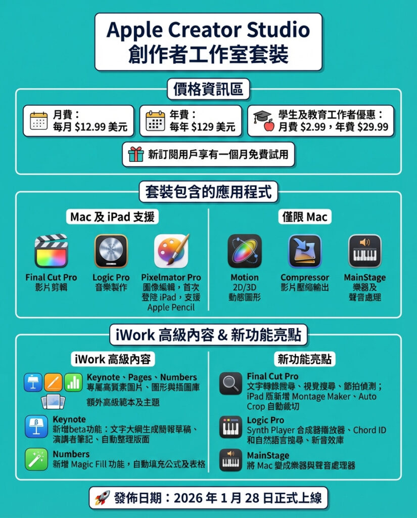 「Apple Creator Studio」將於 1 月 28 日正式開放訂閱,所有新用戶均可享有一個月免費試用期。