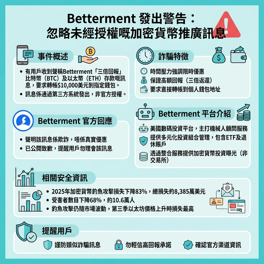 今次Betterment未經授權訊息事件,再次凸顯加密貨幣領域的詐騙風險與資訊安全挑戰。即使是知名的數碼投資平台,也可能因第三方系統漏洞而成為詐騙訊息的「代言人」,提醒用戶在接收任何涉及資金轉帳的訊息時,必須保持高度警覺,切勿被高回報承諾所迷惑。