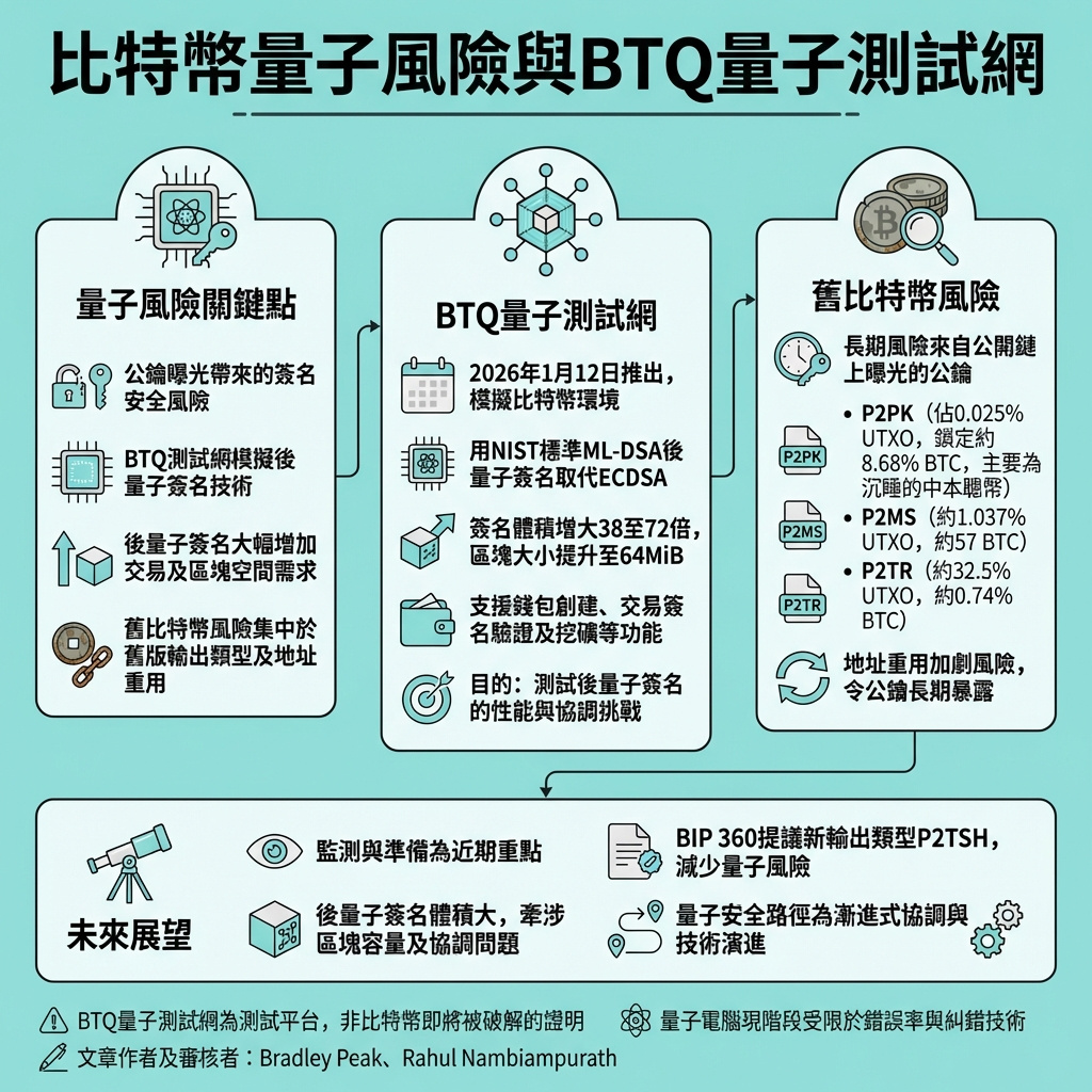 BTQ 的測試網正是為了讓工程師觀察後量子簽名在比特幣環境中的運作成本和限制,而非宣稱比特幣即將被破解。