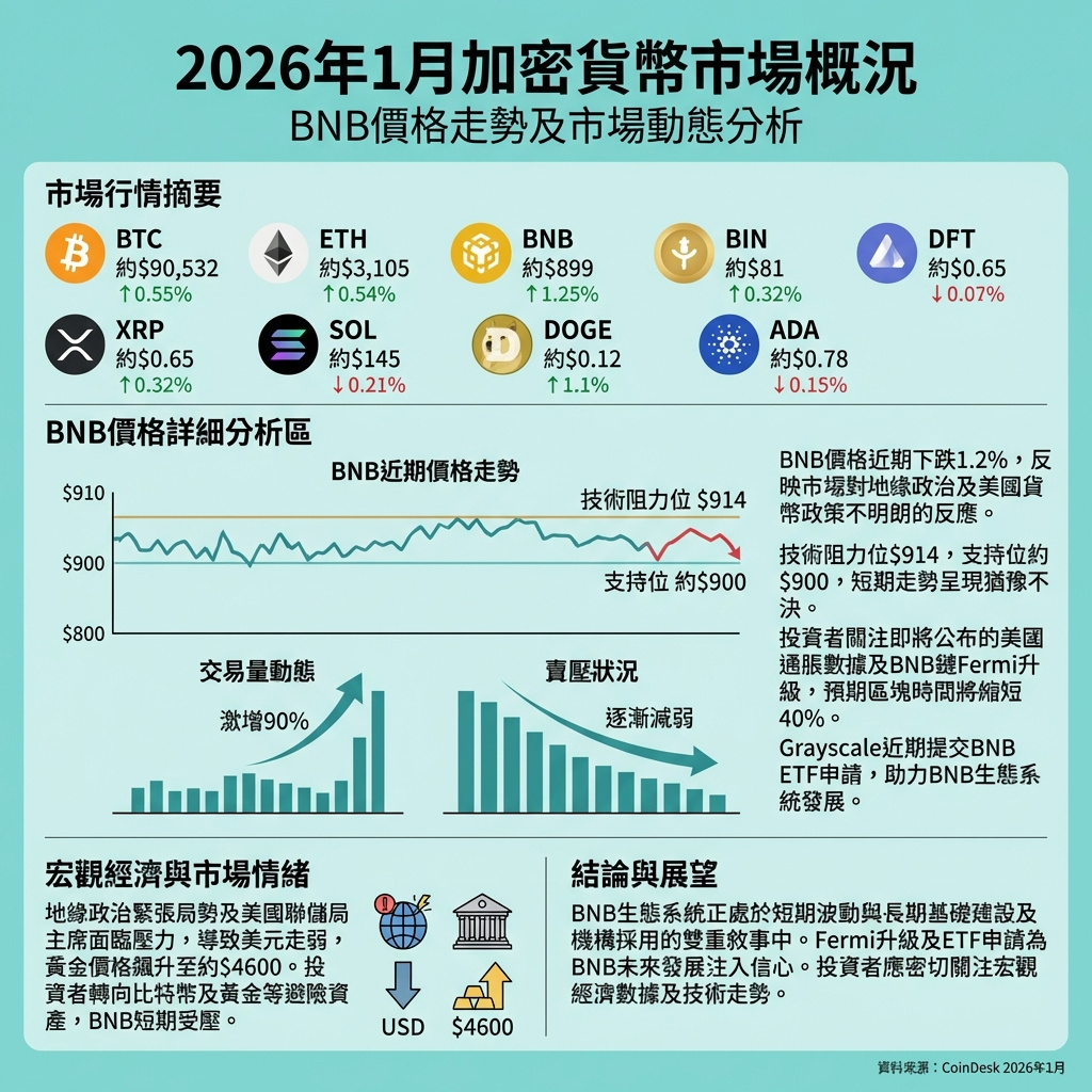BNB(BNB Chain的原生代幣)在過去24小時內下跌1.2%,報900.9美元,表現落後於整體加密貨幣市場。CoinDesk 20指數(CD20)同期下跌0.6%。這波跌勢主要源於地緣政治緊張升溫及美國貨幣政策的不確定性,促使投資者轉向比特幣和黃金等避險資產。
