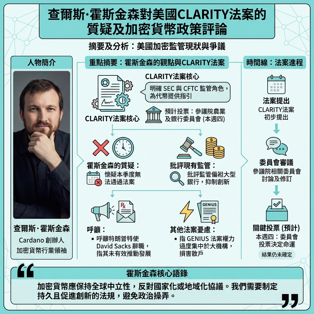 Cardano創辦人Charles Hoskinson近日表示,他懷疑美國的《數字資產市場明確法案》(CLARITY Act)能否在本季度通過,並批評美國的加密貨幣法規偏袒大型銀行,忽視創新發展。他更直言,特朗普的加密貨幣顧問David Sacks應該辭職。