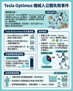 Tesla Optimus機械人公開示範大失誤,跌倒搞笑片段爆紅,揭示特斯拉機械人發展仍未成熟,競爭激烈,市場前景充滿挑戰。