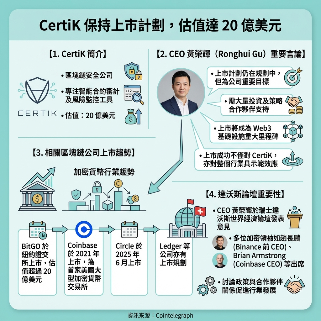 CertiK專注於區塊鏈安全,為加密項目提供智能合約審計及風險監控工具。近年來,區塊鏈及加密領域多間公司積極籌備上市,包括Ledger及BitGO。BitGO於本週四在紐約證券交易所掛牌,估值超過20億美元。美國首個大型加密交易所Coinbase早於2021年上市,穩定幣發行商Circle亦於2025年6月跟進。