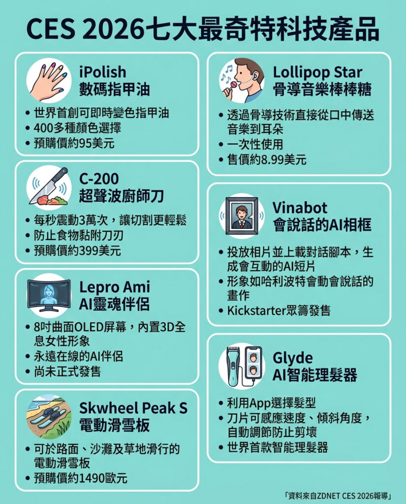拉斯維加斯嘅消費電子展(CES)一向係展示年度最怪異同瘋狂科技產品嘅地方。2026年嘅CES一樣充滿驚喜,由能摺衫嘅人形機械人、AI智能理髮器,到通過骨傳導技術由口中放送音樂嘅棒棒糖,種種新奇發明令人眼前一亮。