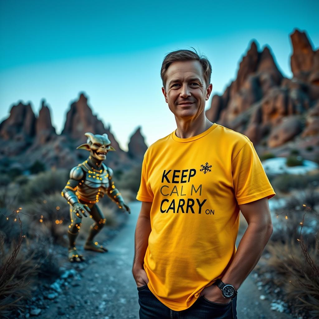 我再試咗將背景換成好出名嘅Vasquez Rocks(星艦迷應該知,係《星際迷航》經典一幕嘅取景地),仲叫ChatGPT幫我加埋經典敵人Gorn。雖然Gorn嘅比例同位置有啲怪,感覺似合成圖,但整體效果已經幾好,尤其係陰影同光線配合得唔錯。