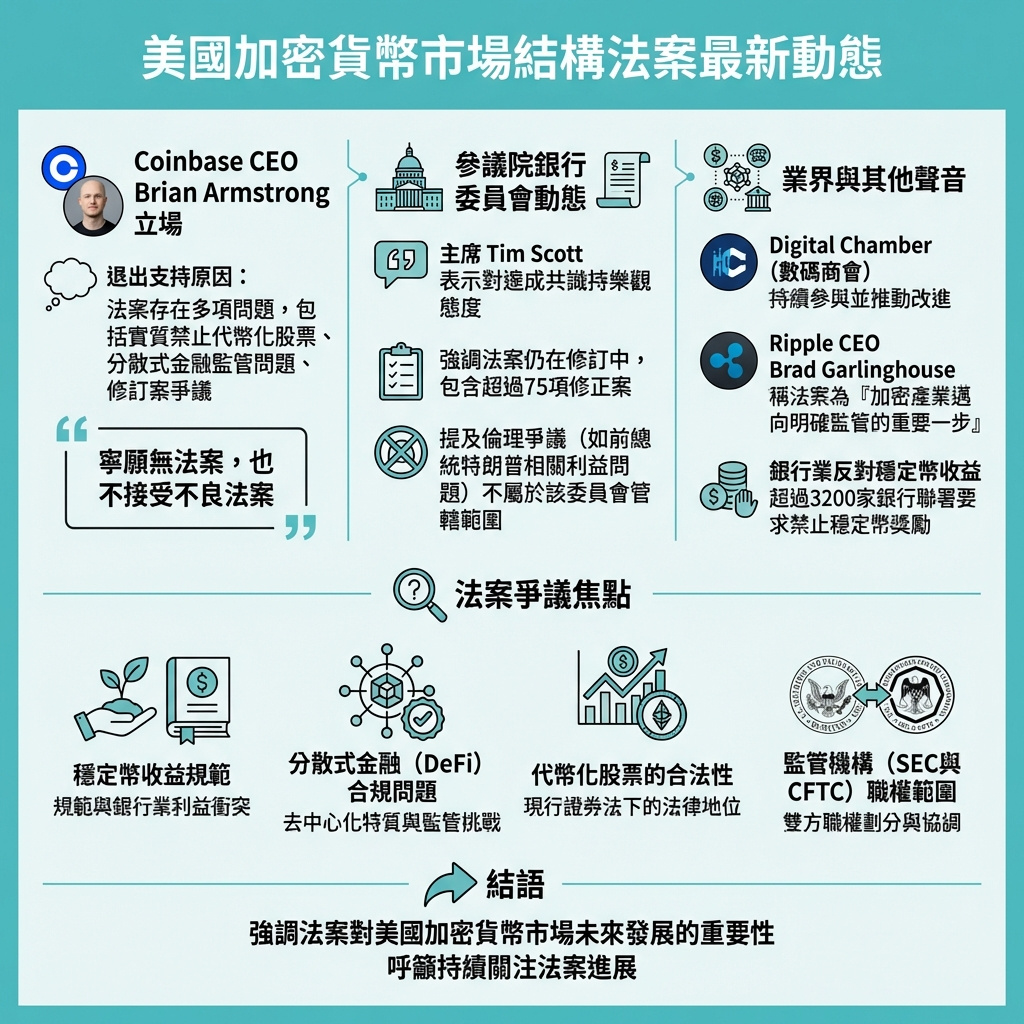 Coinbase作為美國最大的加密交易所之一,公開撤回對參議院加密市場結構法案的支持,反映出當前美國加密監管立法面臨的複雜挑戰。法案涉及的多項爭議不僅是技術層面,更深刻觸及行業生態、用戶權益與監管機構權限的平衡。