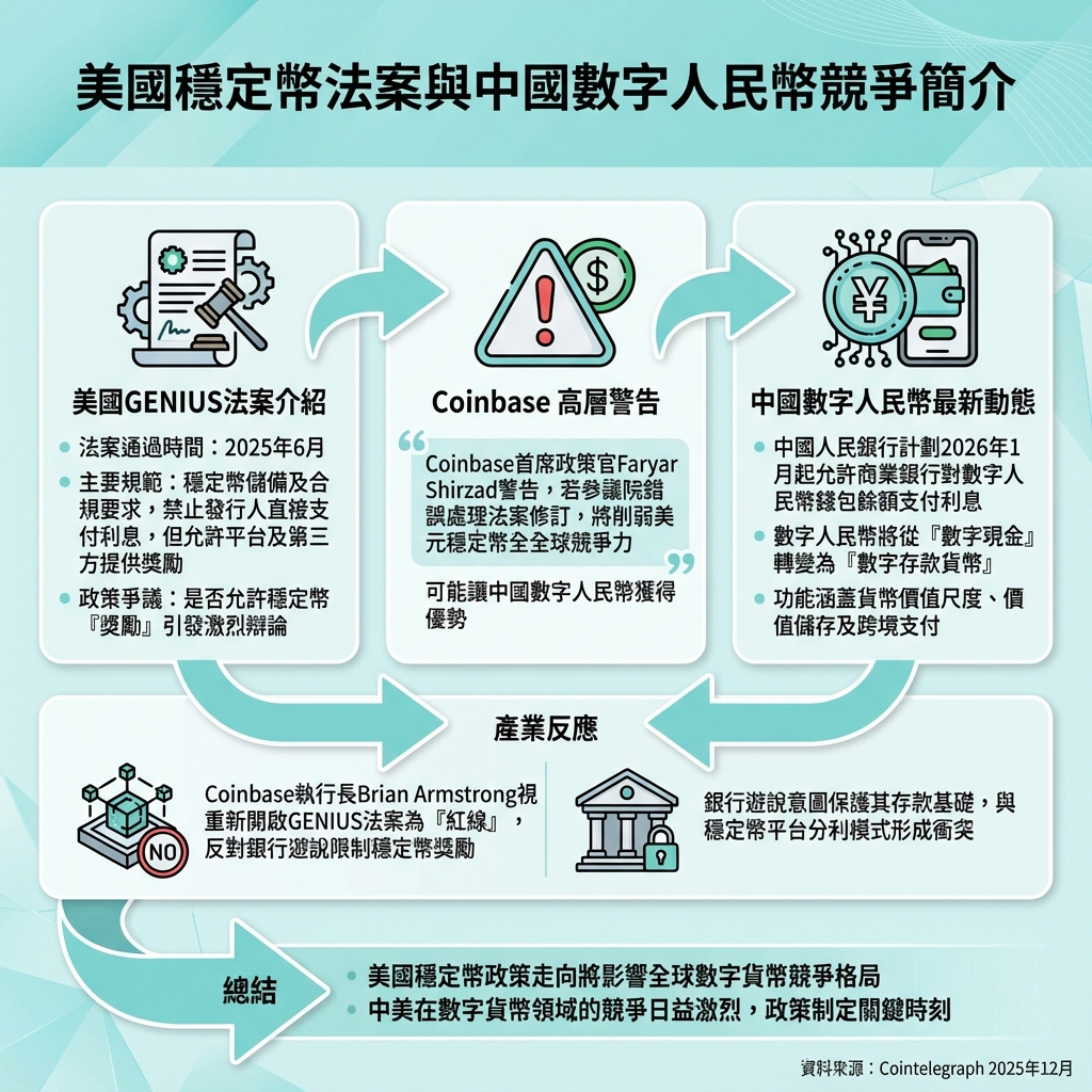 Coinbase一位高級主管警告,美國對穩定幣框架的修訂,可能削弱美元穩定幣的競爭力,正值中國積極推動數字人民幣(CBDC)成為更具吸引力的支付工具。