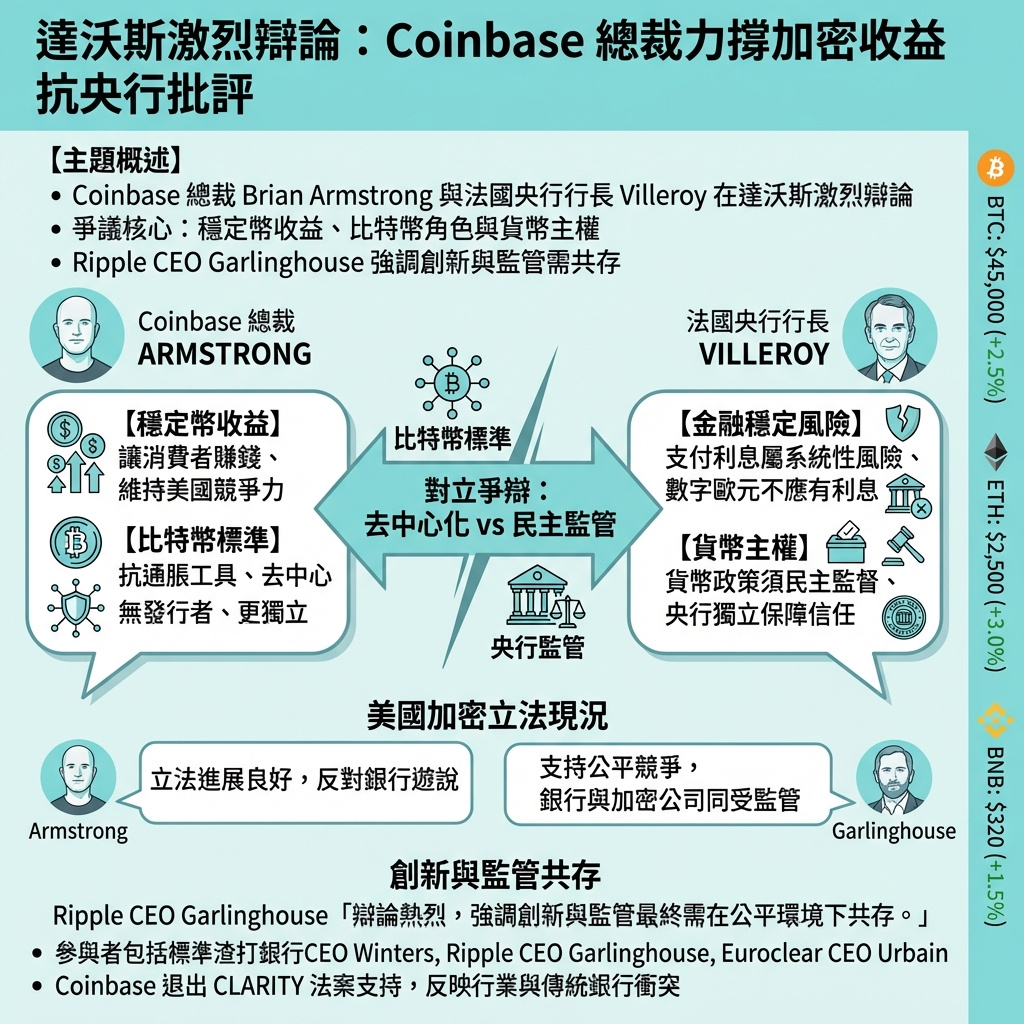在瑞士達沃斯舉行的世界經濟論壇(WEF)中,一場原本討論區塊鏈代幣化的座談會,最終演變成Coinbase行政總裁Brian Armstrong與法國央行行長François Villeroy de Galhau就穩定幣收益及比特幣的激烈辯論。