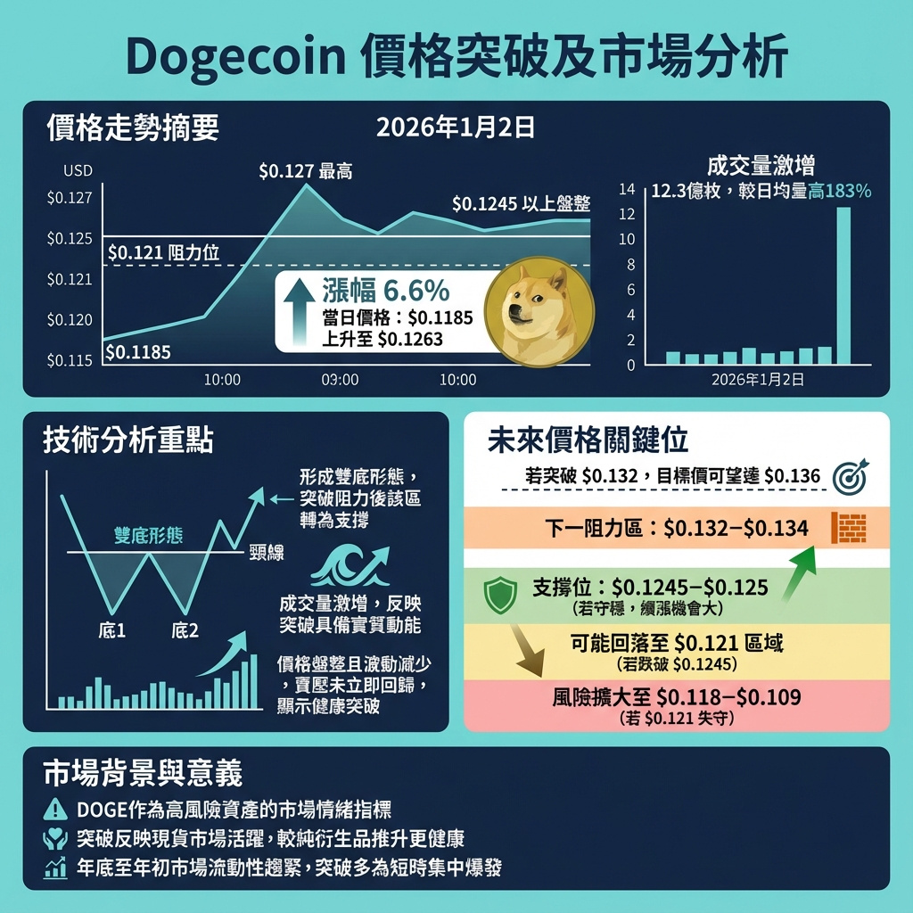 技術面上,狗狗幣由0.1185美元升至0.1263美元,突破了多次未能攻破的0.121美元阻力。成交量達12.3億枚,較日均量高出約183%。價格在1月1日下午3時達到當日高位約0.127美元。這次突破形成雙底形態,將原本的阻力區變成潛在回測支撐區。價格收市時維持在0.1245美元以上,並呈現整固態勢,未見急速回落,顯示突破較為穩健。