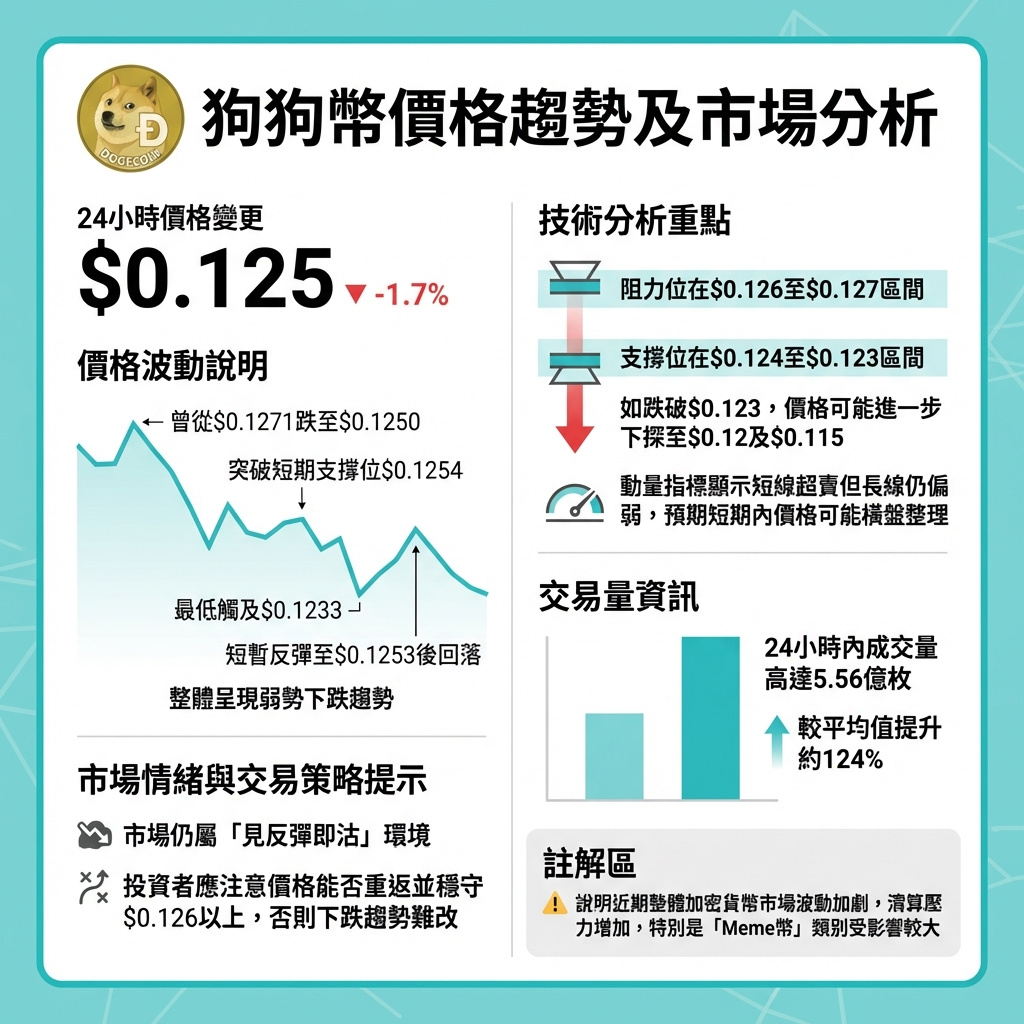 近期狗狗幣價格下跌約1.7%,跌至約0.125美元,主要因為高成交量的跌破短期支撐位,令市場形成看淡格局。交易環境依然是「見反彈即沽」,阻力位穩固於0.126至0.127美元區間,日內僅有短暫且力度有限的反彈。