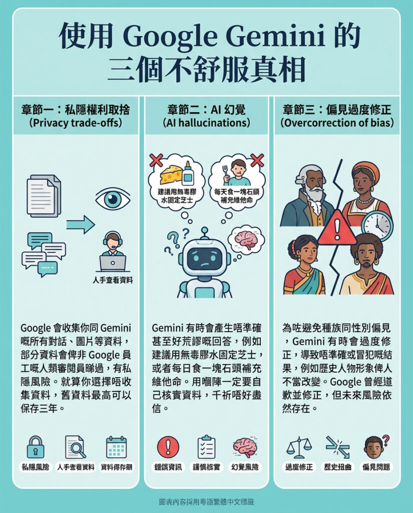 不過,Gemini遠非完美,正如ChatGPT有啲不為人知嘅問題,Google嘅AI助理同聊天機械人都有啲缺點,係每個用家都應該知道嘅。佢唔一定準確,有時會出現「幻覺」——即係生成錯誤或虛假資訊,呢點同大部分生成式AI一樣。此外,為咗提升模型表現,Google會由真人審核部分用戶同Gemini嘅對話,牽涉到私隱問題。Gemini亦被指存在偏見同過度修正嘅問題。如果你認真想用Google Gemini,就要清楚佢嘅權衡與隱藏嘅現實。