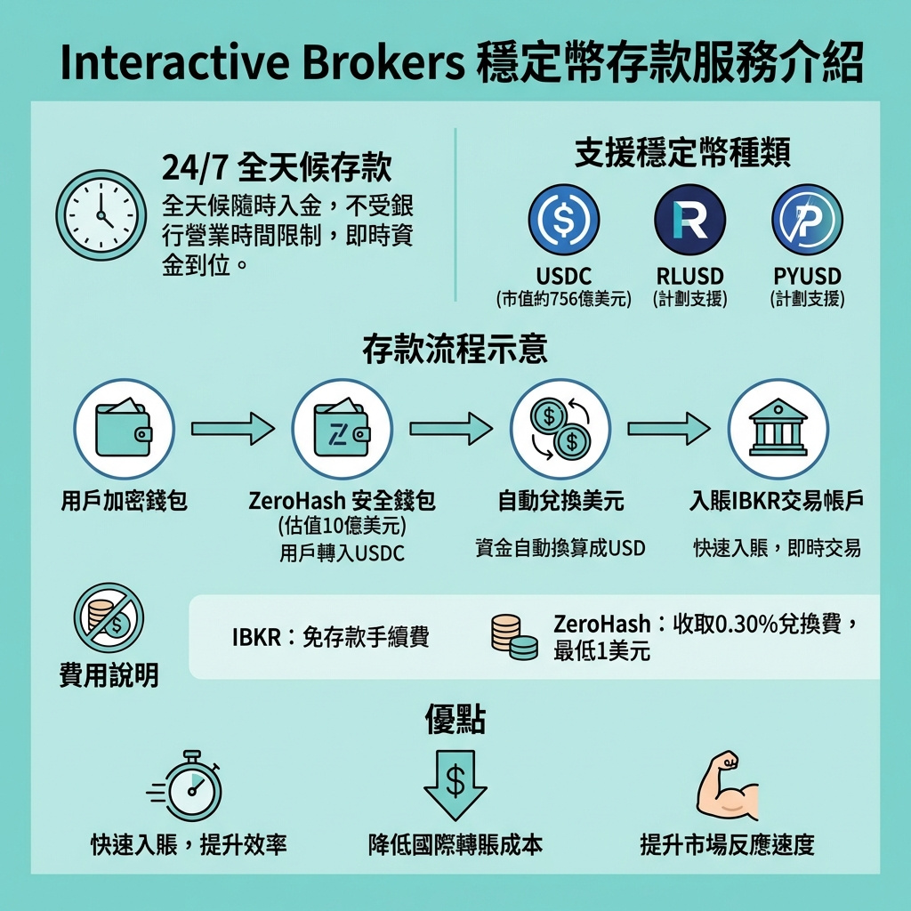 合資格的Interactive Brokers LLC客戶現可隨時隨地以穩定幣存入資金,資金會即時兌換成美元並於數分鐘內入賬至其經紀帳戶。
