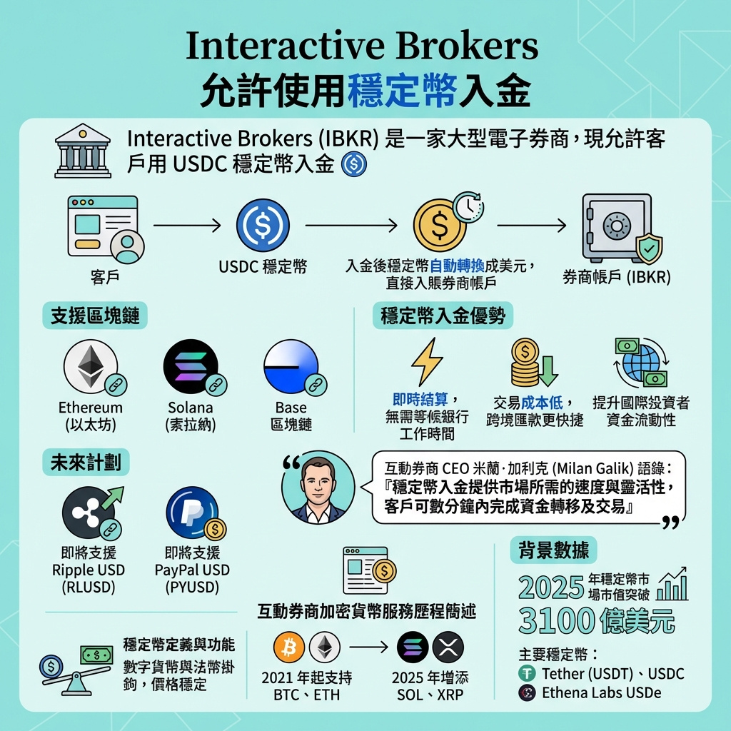 Interactive Brokers於本周四透露,已與穩定幣基建供應商zerohash合作,容許客戶透過以太坊、Solana或Base區塊鏈上的USDC存入資金。存入的穩定幣會即時自動轉換成美元,並存入客戶的券商帳戶。公司亦計劃下周新增對Ripple USD(RLUSD)及PayPal USD(PYUSD)的支援。