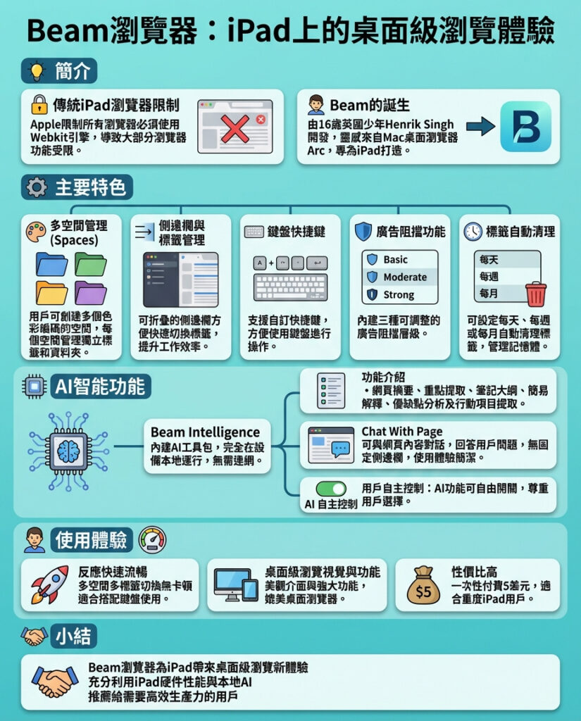Beam瀏覽器喺iPad平台上,突破咗蘋果WebKit引擎嘅限制,帶嚟一種罕見嘅桌面級瀏覽體驗,尤其係針對使用鍵盤嘅專業用戶。開發者年輕,卻展現出對用戶痛點嘅深刻理解同細緻打磨,這點令人佩服。佢對Arc瀏覽器嘅靈感借鑒,令Beam喺設計同功能上都有明顯優勢,尤其係多空間管理同自訂快捷鍵,提升生產力。