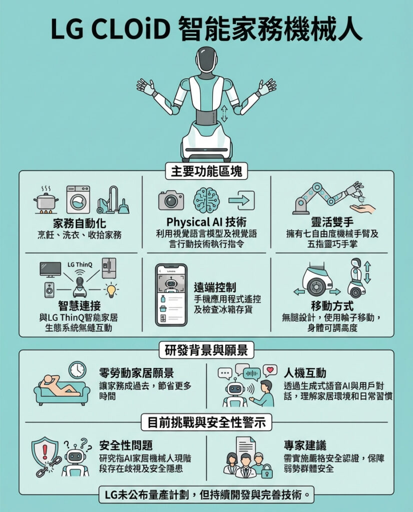 韓國電子巨頭 LG 最近在 2026 年拉斯維加斯舉行的 CES 展覽中,正式展示了最新家居機械人 CLOiD,專為烹調、清潔及處理家務而設。這款配備輪子的仿人型機械人,擁有靈巧的雙手和視覺學習能力,旨在透過先進的物理人工智能(Physical AI)自動完成日常家務,實現 LG 的「零勞動家居」願景。