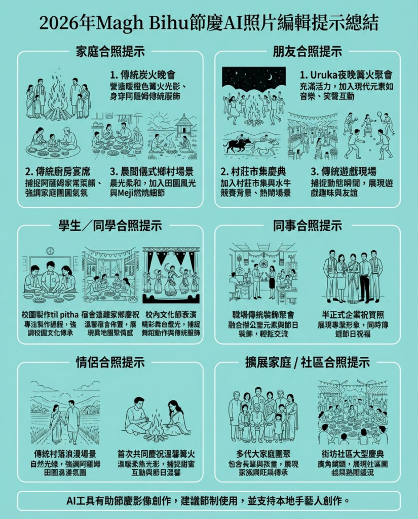 今時今日,AI 技術為節慶創作帶來嶄新可能,尤其係繁忙生活中想快速製作有特色賀卡嘅人。文章提供嘅 AI 修圖提示不但細緻入微,仲貼合 Assam 傳統文化,從家庭到社區、學生到職場,都有適合嘅場景,充分展現 Magh Bihu 節慶嘅多元面貌。