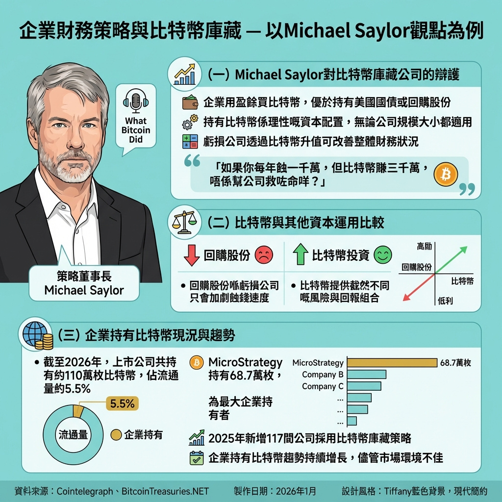 Saylor進一步指出,買回股票和持有低息國債對於虧損企業來說,只會加劇損失,而比特幣則提供了截然不同的風險與回報組合。他批評市場對持有比特幣的公司標準過於嚴苛,反而對不持有比特幣的數以百萬計公司視若無睹,「你竟然覺得四億家公司不買比特幣是可以接受的,卻要批評那兩百家買了比特幣的公司。」
