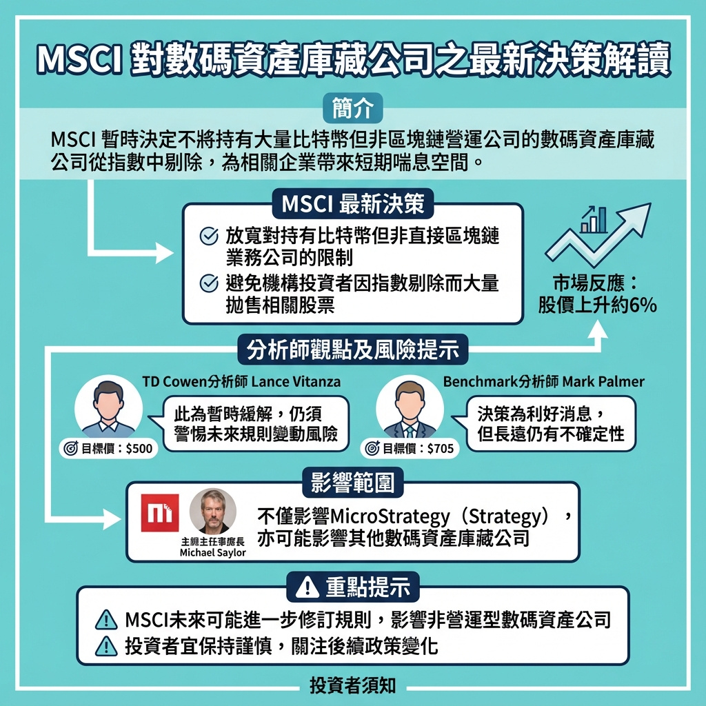 MSCI決定暫時不將持有大量比特幣但非區塊鏈直接營運的數字資產財庫公司,如Strategy,從其指數中剔除,令Strategy股價在盤後交易中上升近6%。此舉暫時緩解了這類公司的壓力,因為若被正式剔除,機構投資者可能會被迫減持,導致股票需求下降。