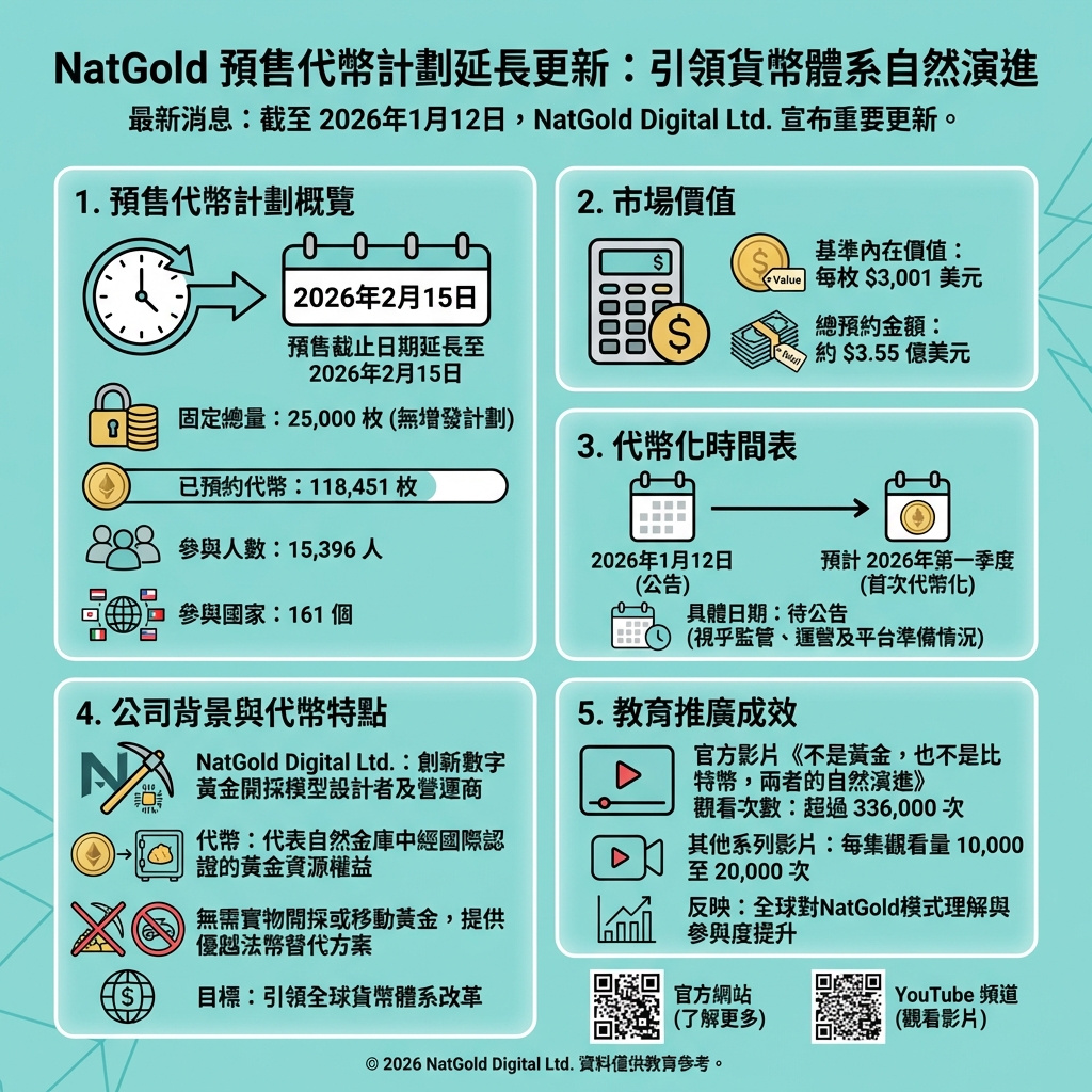 美國邁阿密,2026年1月12日 — NatGold Digital Ltd.(以下簡稱「NatGold」或「公司」)今日公布其NatGold代幣預售預訂計劃的最新參與數據,顯示全球需求持續加速,並確認預訂窗口將延長至2026年2月15日。