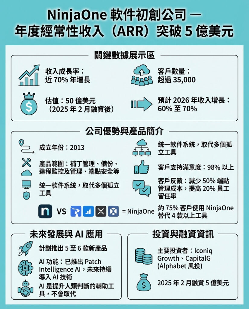 展望未來,NinjaOne預計2026年營收將再增長60%至70%,並計劃推出5至6款新產品,其中部分或將融合人工智能技術。