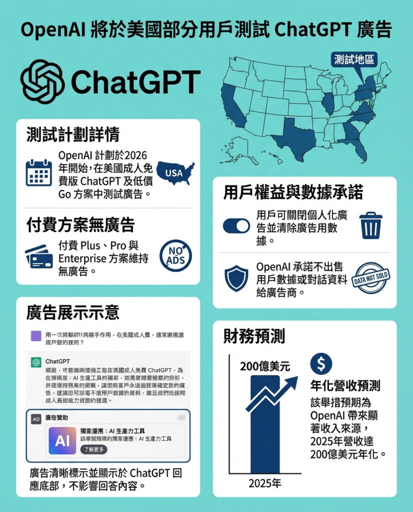 OpenAI計劃於美國對部分成人用戶的免費版ChatGPT開始測試廣告,而付費的Plus、Pro和Enterprise方案則仍維持無廣告狀態。公司同時表示,上週(1月16日)剛在美國推出的低價Go方案用戶,也會開始看到這些廣告。