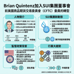 前CFTC專員Brian Quintenz加入SUI集團董事會,助力數字資產策略。特朗普提名被撤後,他如何影響加密監管?你認為此舉對業界有何啟示?