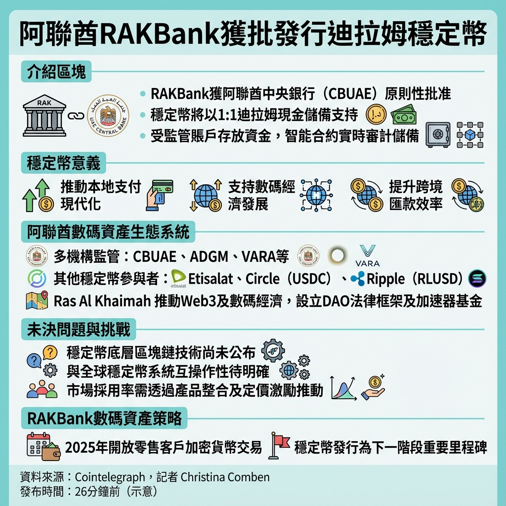 RAKBank獲得阿聯酋中央銀行(CBUAE)原則性批准,準備推出以迪拉姆為支持的穩定幣,成為本地銀行加入阿聯酋穩定幣競賽的新成員。