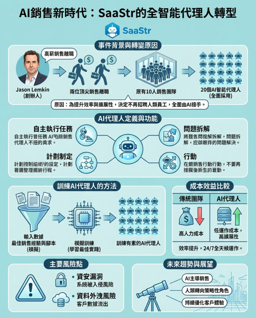 Jason Lemkin的舉措,無疑是企業運用AI技術改造銷售模式的一個先鋒案例,亦反映出AI代理在商業運作中漸趨成熟和實用。由於銷售本質涉及大量重複性工作和標準化流程,AI代理的介入能有效減低人力成本,提升效率,並且減少人員流失帶來的招聘培訓負擔。