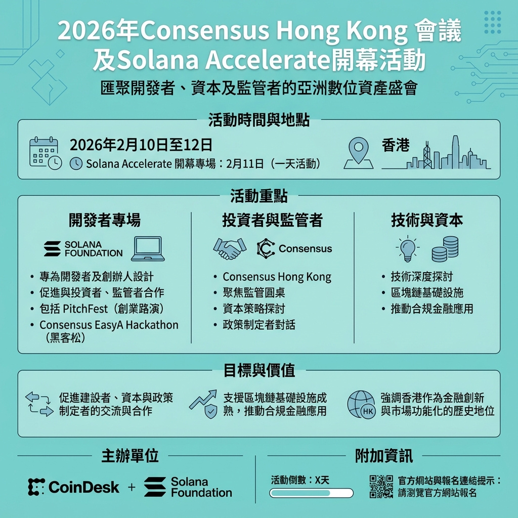 CoinDesk 與 Solana 基金會宣布,專為開發者設計的 Solana Accelerate 活動,將於 2026 年 2 月 11 日在 Consensus 香港會議中正式啟動,為為期一週的活動定下基調,聚焦開發者、生態系統建設者、資本方及政策制定者的交流合作。