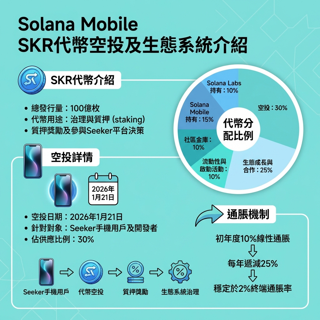 SKR代幣總量固定為100億枚,分配計劃中30%用於空投,包括首次向符合資格的Seeker用戶及開發者派發;25%用於生態系統增長和合作夥伴關係;10%支持流動性及啟動活動;10%作為社區金庫,資助未來生態系統提案;剩餘部分則由Solana Mobile持有15%,Solana Labs持有10%。