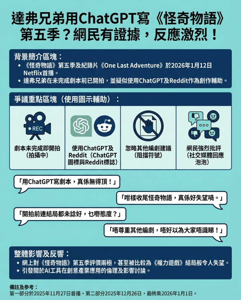Netflix於2026年1月12日推出的紀錄片《Stranger Things:最後的冒險》,本來是為《Stranger Things》粉絲準備的特別內容,展示第五季最終章的前期製作和拍攝過程。不過,這部紀錄片一播出,網上即掀起一股怒火,指責Duffer兄弟(Matt及Ross Duffer)毀掉了這套經典劇集,更爆出他們疑似用ChatGPT人工智能來寫劇本的證據。更令人震驚的是,製作團隊竟然在沒有完整劇本的情況下就開始拍攝第一集。