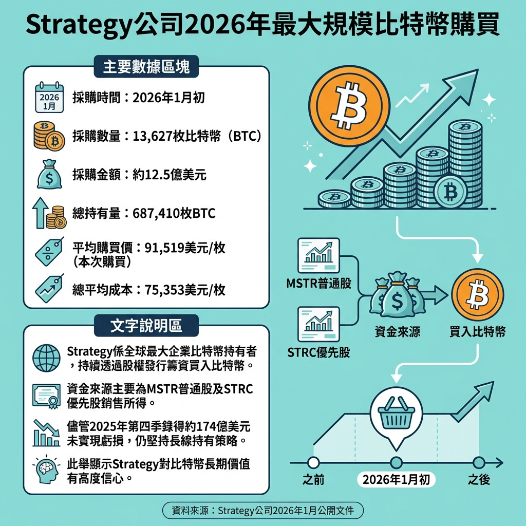文件指出,Strategy此次購買比特幣的資金主要來自其「市場即時發行」(ATM)股票計劃,包括普通股MSTR及可變利率A系列優先股STRC的銷售。公司共籌得約12.5億美元淨收益,並於1月5日至1月7日期間用於買入比特幣。報告中提及的總成本和平均購買價格已包含所有相關交易費用。