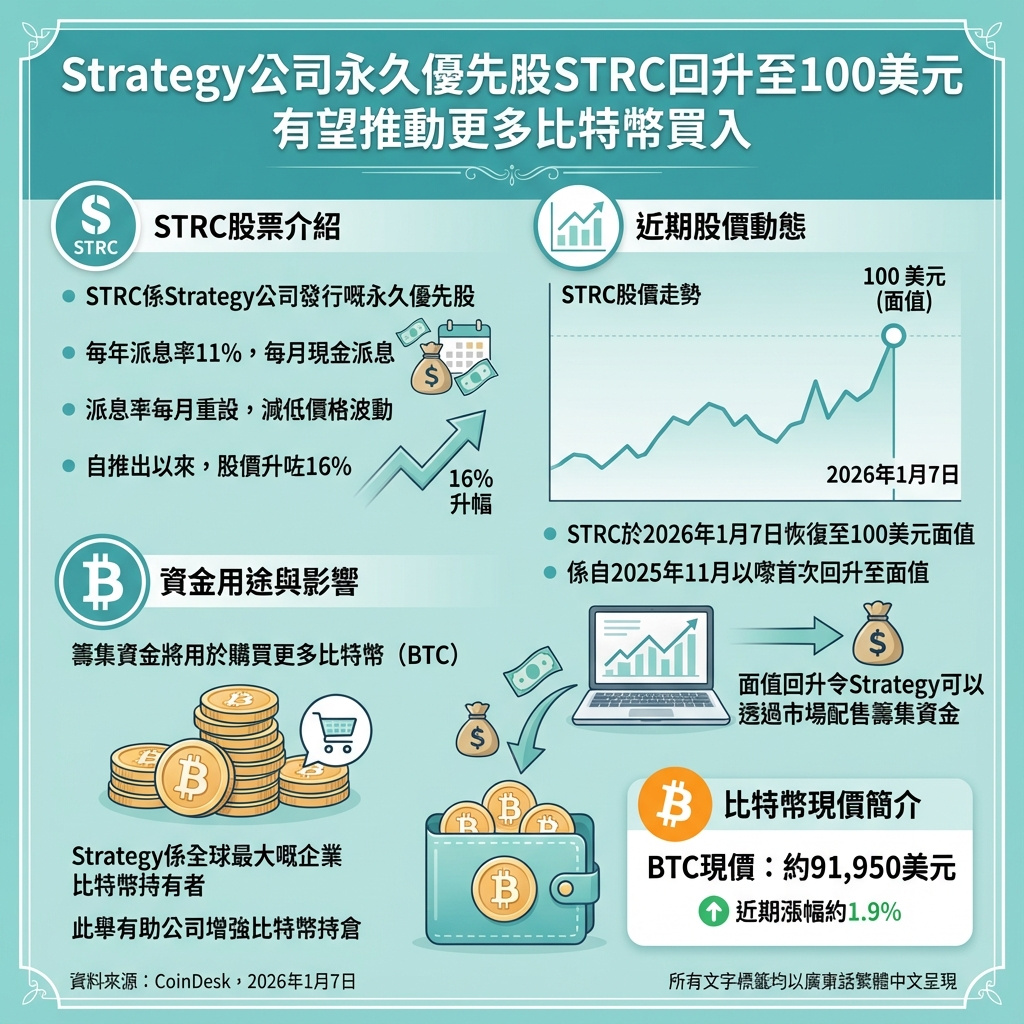 比特幣財務公司Strategy(股票代號:MSTR)發行的永續優先股STRC,於周三盤前交易中首次自去年11月初以來重返100美元面值,為公司透過市價發行股票籌資購買更多比特幣鋪路。
