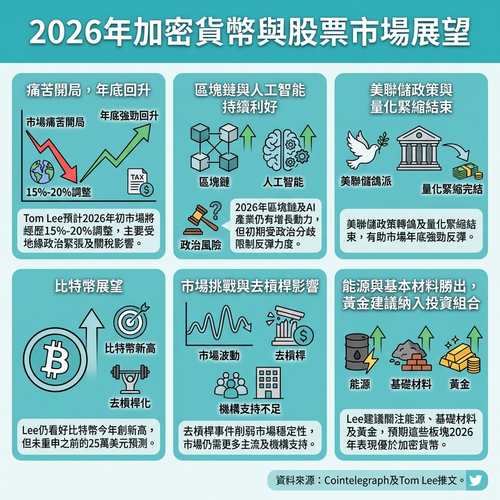 Fundstrat研究主管Tom Lee,同時亦係以太坊財務公司BitMine嘅主席,日前喺訪問中提醒投資者要準備迎接2026年加密貨幣同股市嘅「痛苦下跌」,主要受地緣政治緊張局勢影響,但預計年底會有復甦。