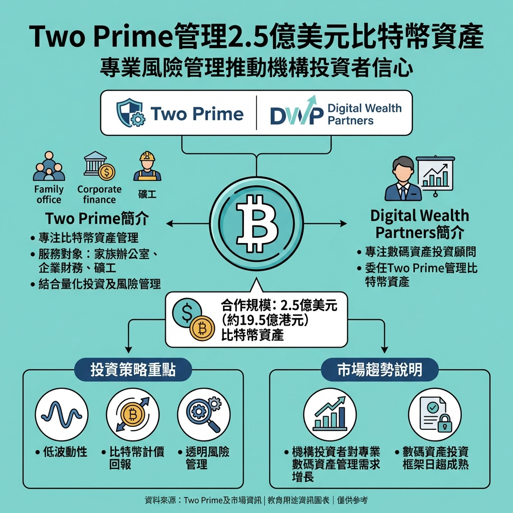 由專注數碼資產投資的顧問公司Digital Wealth Partners選擇,Two Prime將負責管理約2.5億美元的比特幣資產,透過獨立管理帳戶結構運作。此舉顯示機構投資者對專業加密貨幣管理者的信心日增。