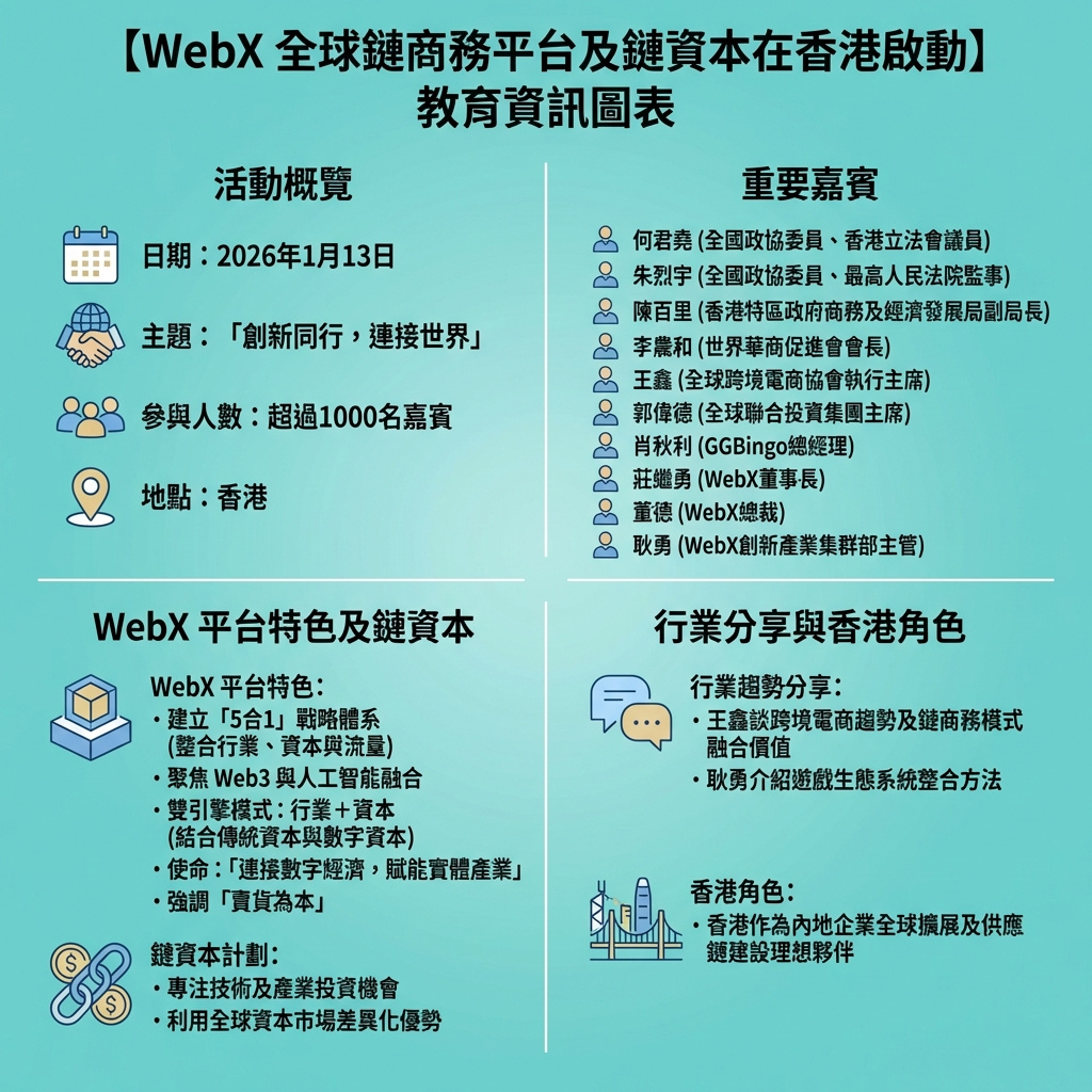 2026年1月13日,WebX在香港舉辦了全球鏈商務平台啟動大會及Chain Capital揭幕儀式,主題為「創新共融,連接世界」,吸引超過一千名參與者。此次發布會正值Web3及人工智能(AI)正重塑全球數碼經濟之際,意義重大。