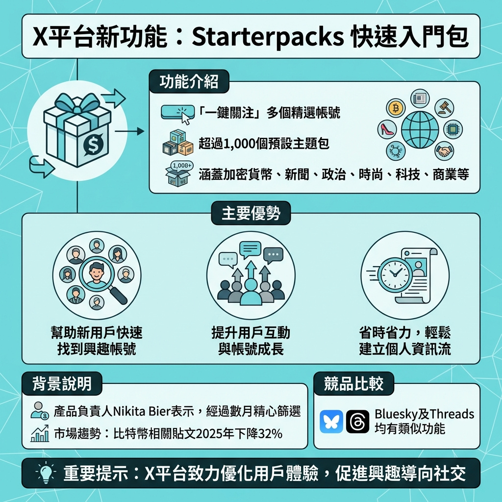 X推出「Starterpacks」功能,顯示平台正積極應對用戶增長及參與度下降的挑戰。加密貨幣話題在社交媒體上的熱度波動,反映市場熱情與大眾關注度的起伏。X此舉不僅是為了讓新用戶快速融入,更是試圖重塑平台的內容生態,從主流新聞政治話題轉向更細分的利基興趣,這有助於提升用戶的個人化體驗和社群連結。