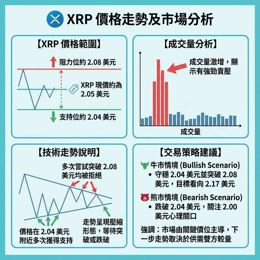 XRP價格持續徘徊於2.05美元附近,區間收窄進入關鍵抉擇階段
