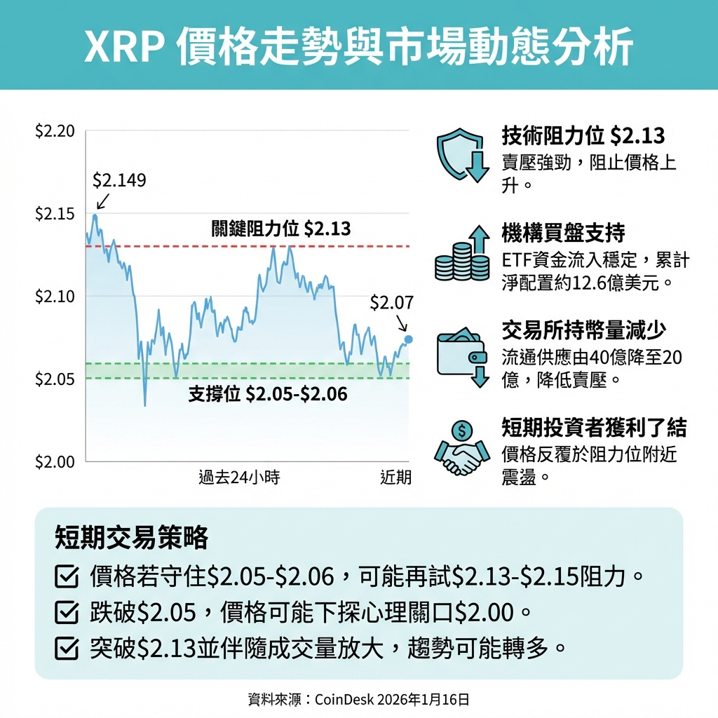 目前市場呈現「逢高賣出」格局,並非趨勢反轉。ETF資金流入和交易所XRP減少支持中期看多,但短線交易者利用$2.13附近獲利離場,只要該阻力位未突破,價格可能維持區間震盪。